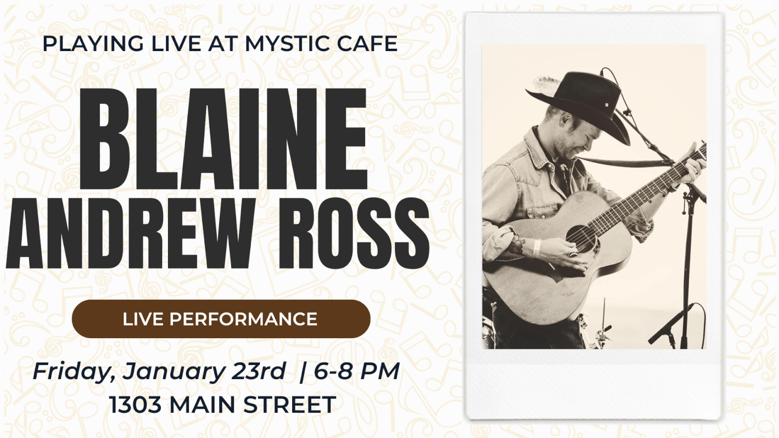 Join us at Mystic for a live performance by Blaine Andrew Ross, bringing his signature country western sound and easygoing storytelling style. Grab a drink, settle in, and enjoy an evening of great music.