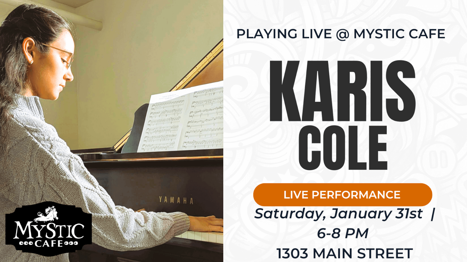 Spend your Saturday night with Mystic Cafe for an enchanting live performance by pianist Karis Cole. Let her captivating music set the mood as you enjoy your favorite Mystic dishes! A wonderful evening of live music and good food awaits!