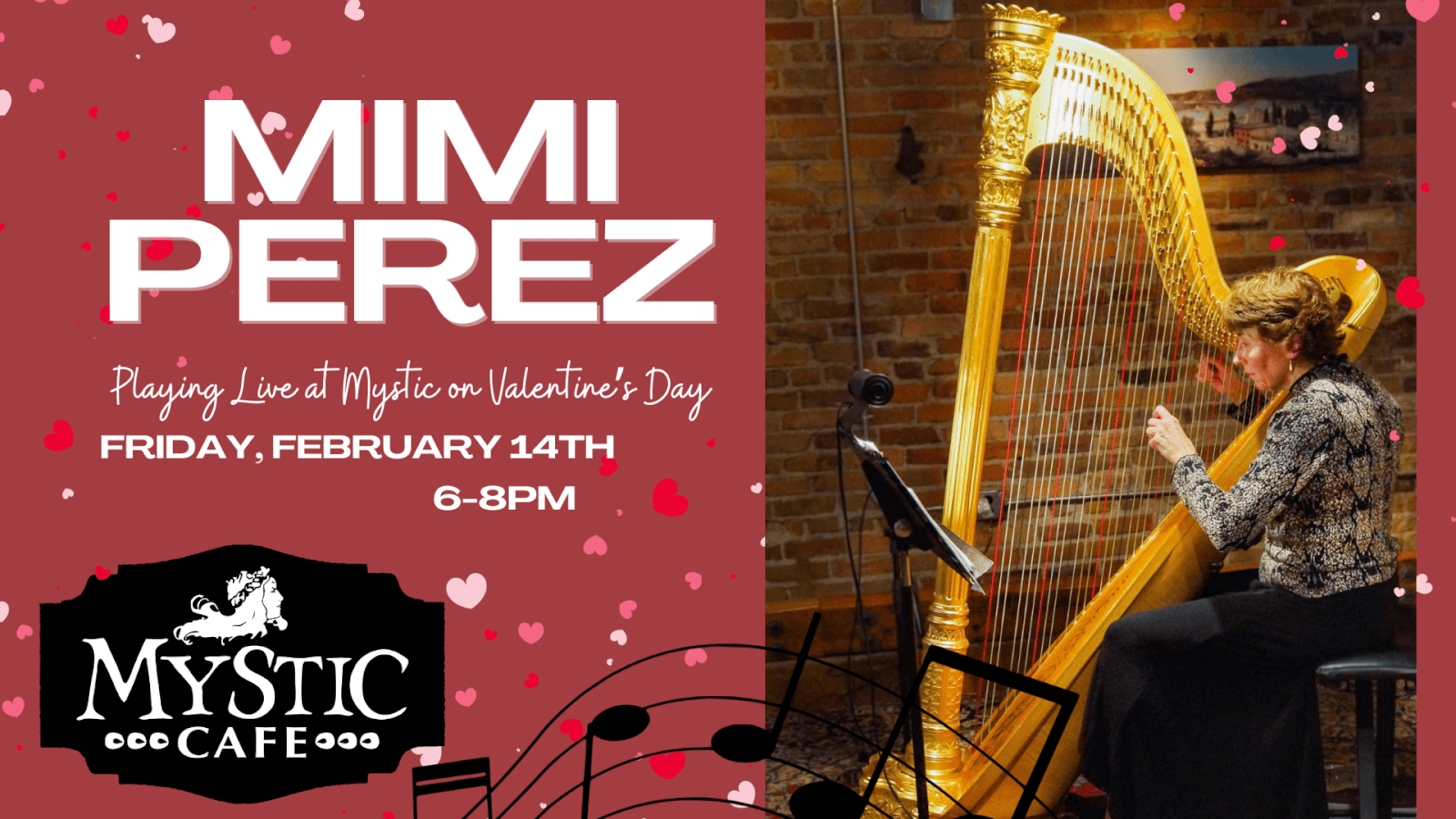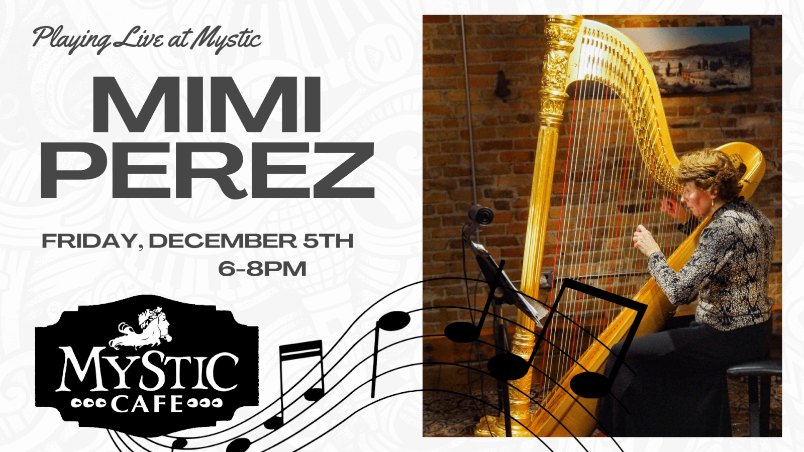 Join Mystic Café for a wonderful night of beautiful melodies from a local favorite, Mimi Perez! Her talent on the harp creates a wonderful and romantic ambiance you won’t want to miss. Pair her music with our local beer, wine, and delicious menu items for an unforgettable night here Mystic!