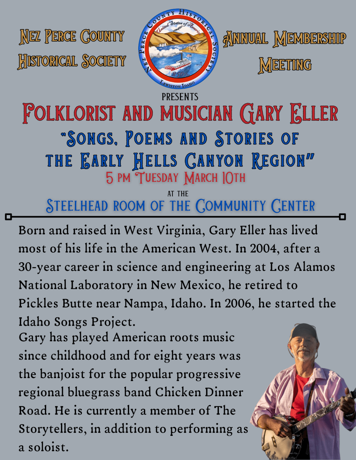 Folklorist and musician Gary Eller will be at the Nez Perce County Historical Society’s Annual Membership Meeting Tuesday, March 10 at 5pm in the Steelhead Room of the Community Center.