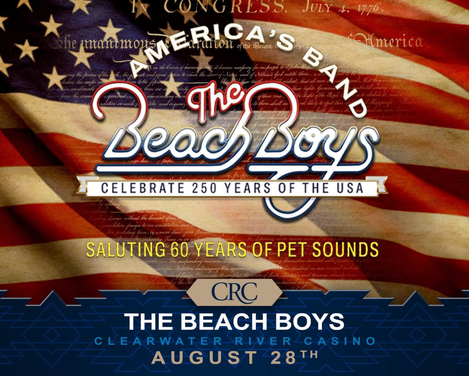 Presenting America’s Band, The Beach Boys, celebrating 250 years of the USA while saluting The 60th Anniversary of Pet Sounds at the Clearwater river Casino for one night only on August 28th. Enjoy decades of timeless hits in just one night with The Beach Boys.